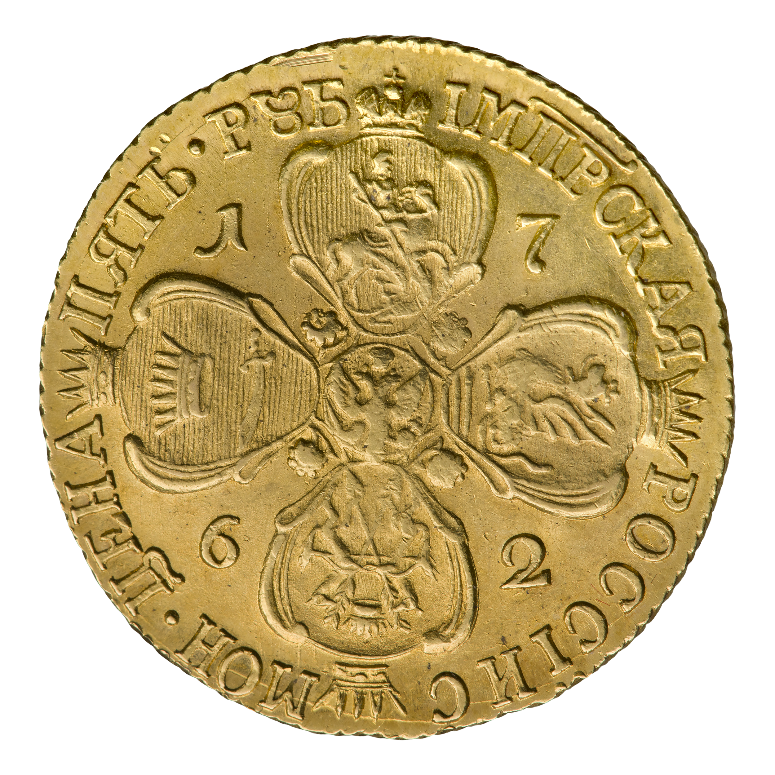 Об. ст.: Крестообразная композиция из гербов — Московского, Казанского, Сибирского и Астраханского царств, с гербом Российской империи в центре. В полях между щитами дата: 1762.